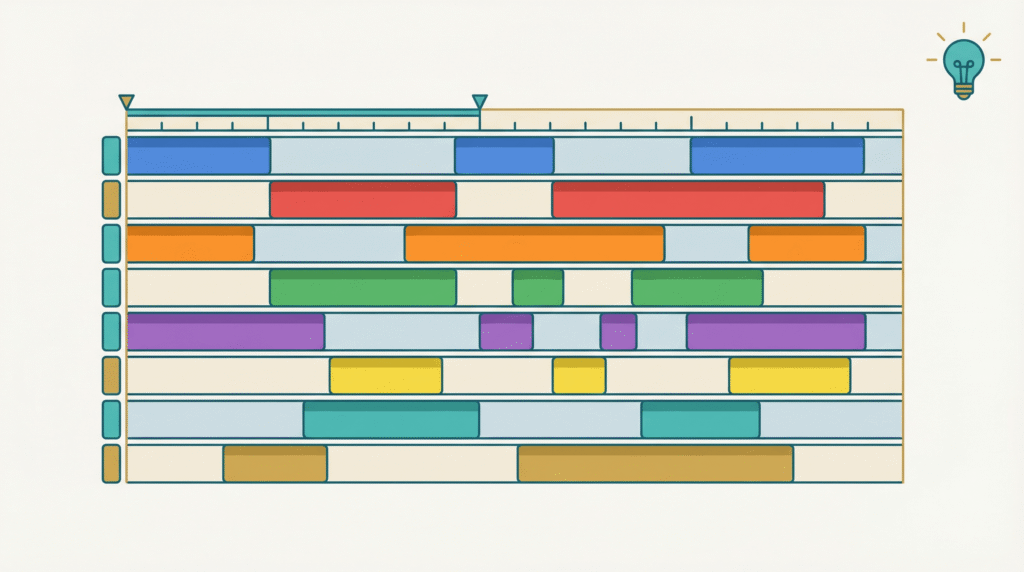 8トラックの配分例: ボーカル(1) + ドラム(1) + ベース(1) + 楽器2本(2) + Return A: Reverb(1) + Return B: Delay(1) + マスター(1) = 8本ぴったり。